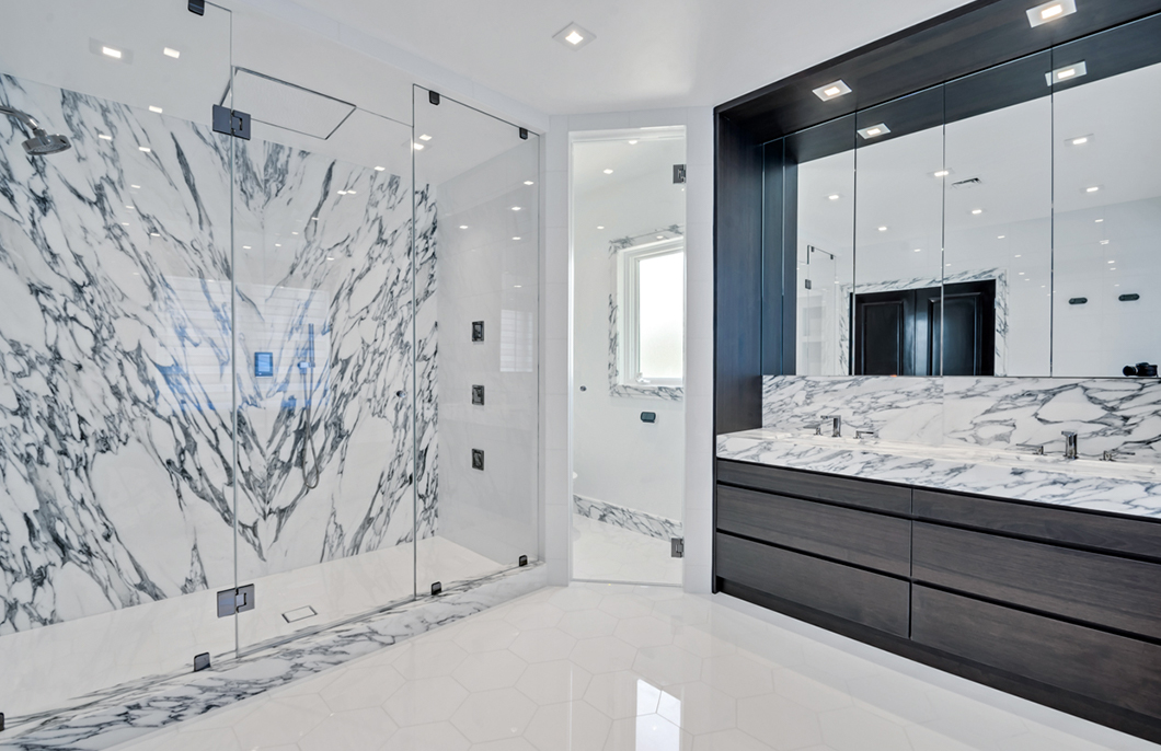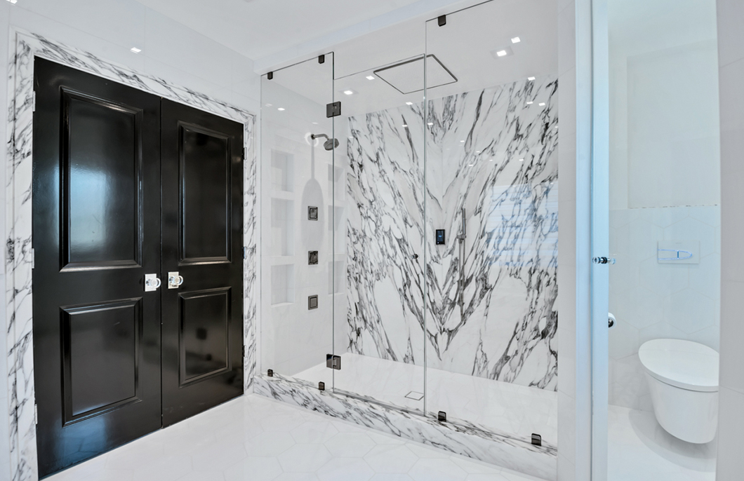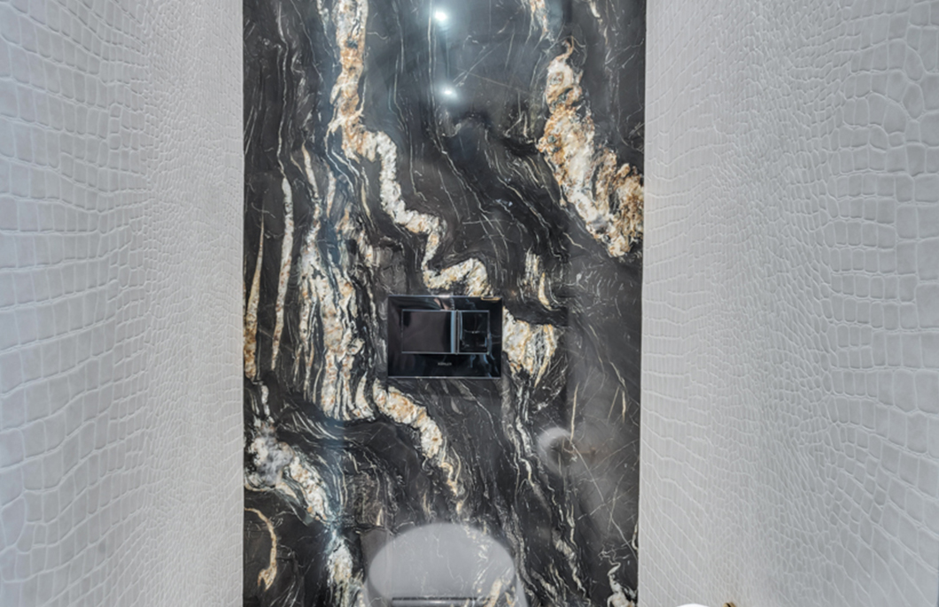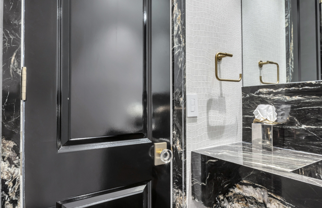 Beautiful and thoughtfully executed, this ultra-luxury Homecrest bathroom remodel transforms both the primary bathroom and powder room into stunning personal sanctuaries. Designed to evoke a spa-like experience while maintaining functionality and elegance, every element was curated with precision, refinement, and beauty in mind. The primary bathroom now features a beautiful, extra-large walk-in shower enclosed in a seamless custom glass surround. At the heart of the shower is a dramatic accent wall clad in a single slab of Arabescato marble. The marble’s bold veining flows gracefully throughout the space, extending across the tub deck, apron, double vanity countertop, and even the trim—creating a continuous, sculptural design that brings cohesion and visual flow. The soaking tub is deep, luxurious, and beautifully integrated, offering a peaceful retreat for relaxation and self-care. A custom double vanity, finished in a rich dark wood, adds warmth and contrast to the cooler marble tones. It offers generous storage and is framed by beautiful brass fixtures that elevate the overall elegance of the room. Thoughtfully placed LED lighting, heated floors, and softly backlit mirrors bring comfort and ambiance, blending function with luxury. Beautiful custom French doors complete the design, lending architectural charm and allowing the bathroom to feel grand and private—like a personal spa tucked within the home. The powder room makes an equally bold and beautiful impression. Designed as a statement space, it features dramatic Belvedere Quartzite marble floors that sweep up into an accent wall and door casing. The striking movement of the stone and its rich dark tones create a sense of drama and depth. A built-in vanity crafted from the same stone ties the elements together and offers a sense of permanence and luxury. To add texture and personality, beautiful crocodile-patterned wallpaper wraps the remaining walls, introducing a tactile and unexpected layer of design. Brass fixtures echo the finishes used in the primary bathroom, unifying the spaces and adding a warm, luminous glow. Although smaller in size, the powder room is rich in detail and makes a lasting impression on every guest who steps inside. What was once a basic powder room and dated primary bath is now a pair of beautifully designed, high-end spaces full of elegance, character, and tranquility. Every decision—from material selections to layout and lighting—was made with intention, turning ordinary rooms into something truly special. These bathrooms reflect not just luxury, but a lifestyle—where daily routines are enriched by beautiful surroundings, and thoughtful design enhances every moment. The result is a home our clients are proud of, where comfort meets sophistication and beauty lives in every corner.
