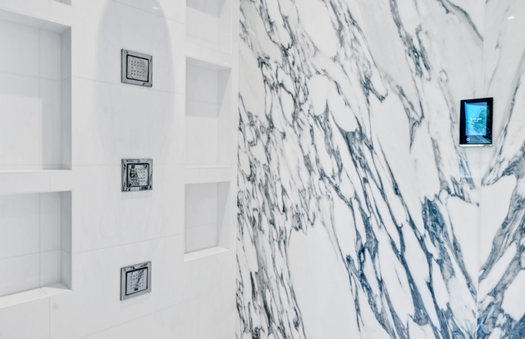- Tiles – Artistic Tile White Thassos wall and floor tile in the master bathroom