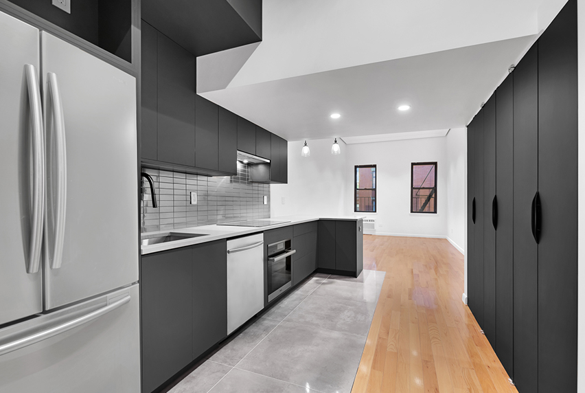 This Washington Square loft renovation is a stunning example of modern design meeting practical urban living. The highlight of the space is a beautifully designed L-shaped kitchen that serves as both a functional cooking area and a bold design statement. Clean lines, rich tones, and subtle textures come together to create a sophisticated and efficient space that perfectly complements the loft's open floor plan and industrial-chic aesthetic. The kitchen features flat panel cabinets in a deep charcoal gray, offering a dramatic yet refined look. These minimalist cabinets not only maximize storage but also contribute to the sleek, contemporary feel of the space. The matte finish contrasts elegantly with the metallic backsplash tiles, which introduce a layer of texture and shimmer. The modern backsplash is not only visually striking, but it also reflects light, helping to keep the kitchen area feeling open and dynamic. Stainless steel appliances integrate seamlessly with the overall kitchen design, reinforcing the modern aesthetic while providing high performance and durability. The cool-toned finishes—seen in the appliances, faucet, and cabinet hardware—complement the gray cabinetry and metallic backsplash, creating a cohesive palette that is both bold and timeless. A signature feature of this loft renovation is the custom wall ladder, which adds an unexpected architectural element. Mounted against a built-in shelving unit, the ladder offers both practicality and design flair. It enhances vertical storage options and brings an urban-industrial charm that’s perfectly in sync with the modern loft vibe. Throughout the loft, design choices were made with intention—balancing the raw, open feel of loft living with clean, curated finishes. The kitchen’s L-shaped layout efficiently uses wall space while leaving the rest of the loft open and airy, ideal for entertaining or relaxed city living. The sleek finishes and modern materials ensure the space feels upscale and effortless. From the thoughtfully designed L-shaped kitchen with charcoal cabinetry and metallic tile accents to the statement-making wall ladder and open layout, this Washington Square loft renovation reflects a deep appreciation for style, function, and quality craftsmanship. It’s a true example of how small design choices—when executed well—can transform a space and elevate the way it’s used every day. Whether you’re looking for inspiration for your own kitchen remodel or dreaming of a high-end loft renovation in the heart of New York City, this project shows how modern design can turn any space into a showcase of beauty and function. Call us today!