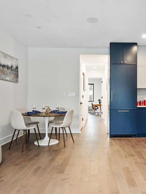 Kitchens work hard. We specify durable, easy‑care floors—site‑finished or engineered hardwood, large‑format porcelain, or stone—paired with sound‑attenuating underlayment common to co‑ops/condos. In townhomes, radiant floor heat adds comfort and helps dry splashes quickly.